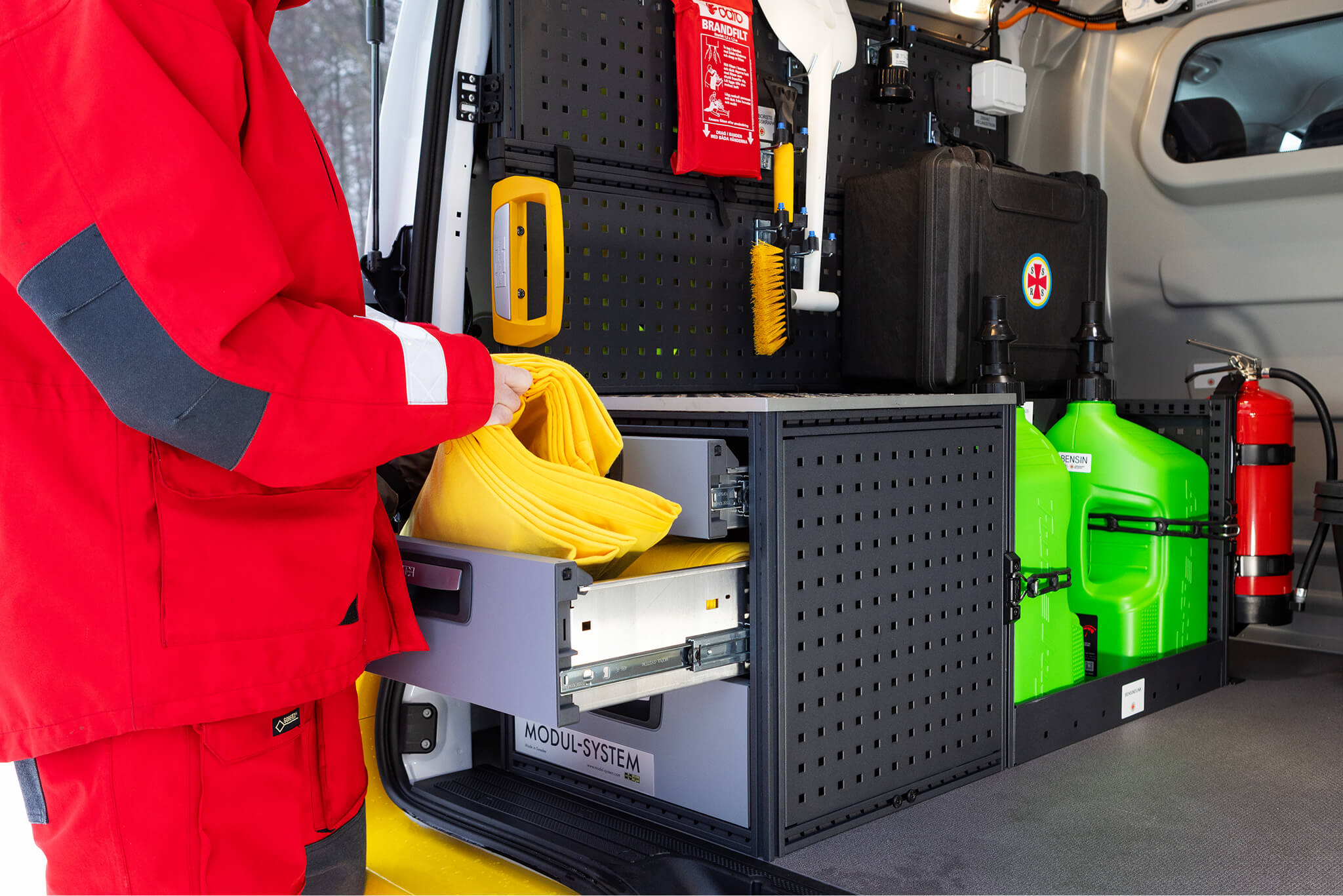 Tillsammans med flera olika leverantörer har Modul-System tagit fram en skräddarsydd lösning som skall fungera under många år. Bilen är byggd av Modul-Systems återförsäljare Kalmar Bilutrustning.
