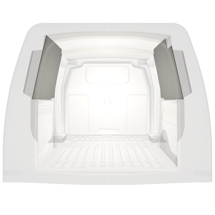 Den färdigskurna beklädnaden är designad för att täcka hela fordonets innerväggar och monteras med skruv.