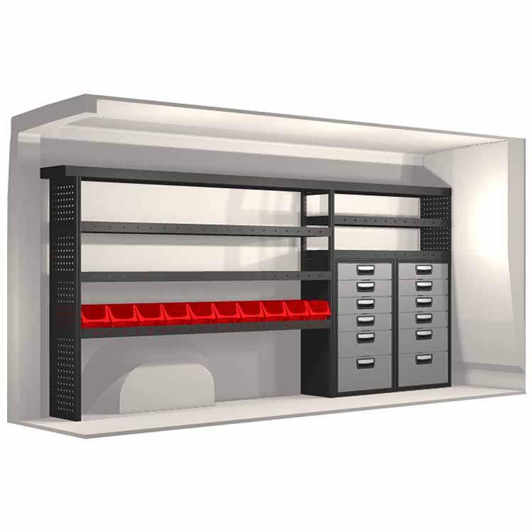 Inredningsförslaget är speciellt utformat för att passa bilmodellen perfekt. I de fall då hurtsar ingår så är dessa utrustade med kullagerskenor samt fullt utdragbara lådor med utdragsstopp. För ökad funktionalitet och minskad ljudnivå under färd är samtliga hyllor utrustade med gummimattor och hurtslådor med skumplast. Monteringssats ingår.