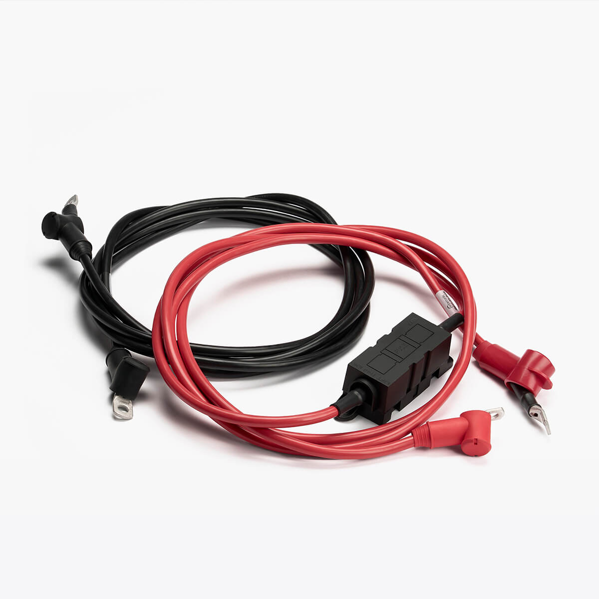 3-meter battery cables designed for the 2028410-03 e-Heate 1000. Pre-fitted with M8 ring terminals, pole protection caps, fuse holder, and fuse.