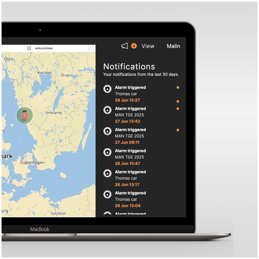 I Kundportalen får du notiser direkt när ett larm triggas och kan enkelt se på kartan vilken bil som larmar. Systemet ger dig full kontroll och överblick över alla händelser, vilket ökar säkerheten och möjliggör snabb åtgärd vid behov.
