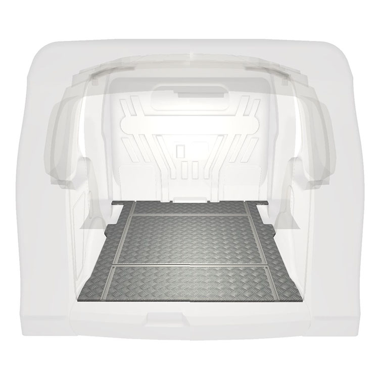 Lätt och robust golv med halkfri aluminiumdurk till en Ford Transit Connect. Golvets integrerade skenor (längsgående och tvärgående) används för snabb och säker installation av bilinredning och andra tillbehör.