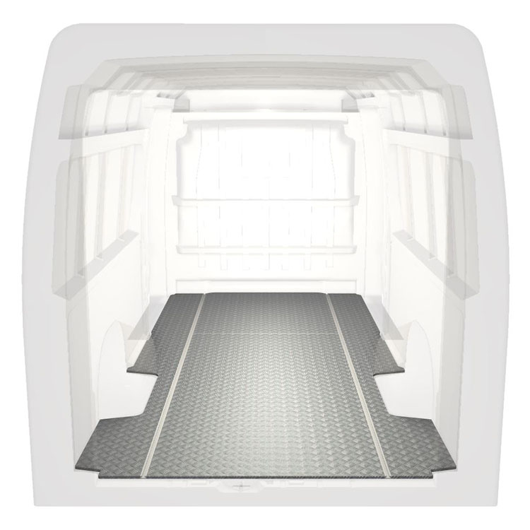 Lätt och robust golv med halkfri aluminiumdurk till en Citroën Jumper / Peugeot Boxer / Fiat Ducato. Golvets integrerade skenor (längsgående) används för snabb och säker installation av bilinredning och andra tillbehör.