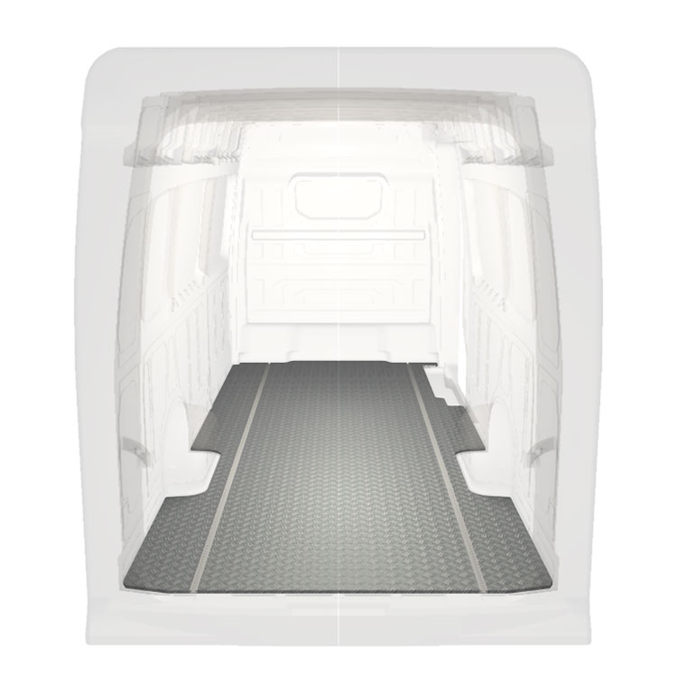 Lätt och robust golv med halkfri aluminiumdurk till en Volkswagen Crafter / MAN TGE . Golvets integrerade skenor (längsgående) används för snabb och säker installation av bilinredning och andra tillbehör.