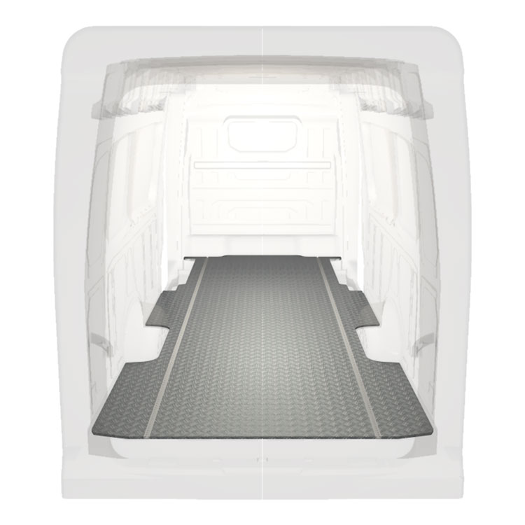 Lätt och robust golv med halkfri aluminiumdurk till en Volkswagen Crafter / MAN TGE . Golvets integrerade skenor (längsgående) används för snabb och säker installation av bilinredning och andra tillbehör.