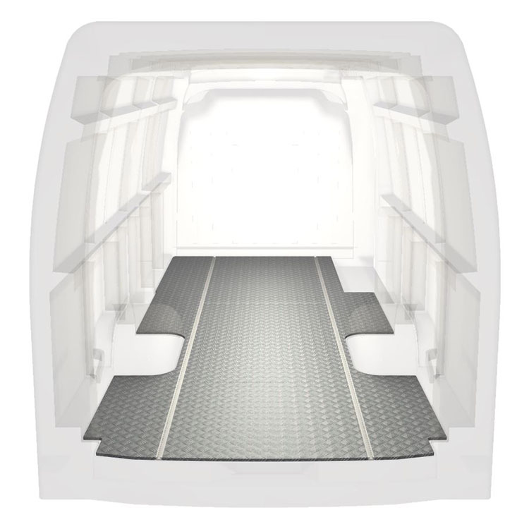 Lätt och robust golv med halkfri aluminiumdurk till en Renault Master / Opel Movano / Nissan NV400. Golvets integrerade skenor (längsgående) används för snabb och säker installation av bilinredning och andra tillbehör.