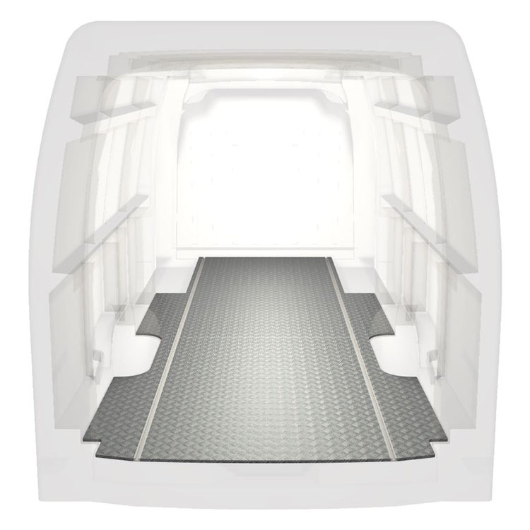 Lätt och robust golv med halkfri aluminiumdurk till en Renault Master / Opel Movano / Nissan NV400. Golvets integrerade skenor (längsgående) används för snabb och säker installation av bilinredning och andra tillbehör.