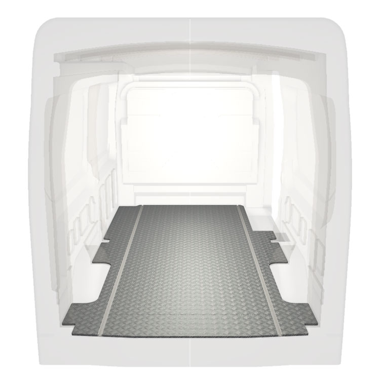 Lätt och robust golv med halkfri aluminiumdurk till en Ford Transit. Golvets integrerade skenor (längsgående) används för snabb och säker installation av bilinredning och andra tillbehör.