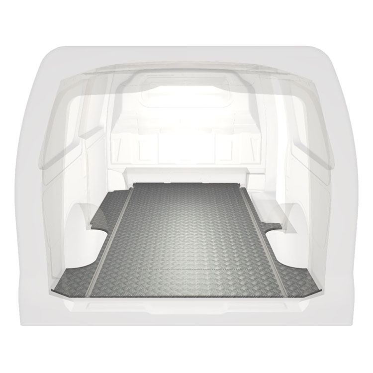 Lätt och robust golv med halkfri aluminiumdurk till en Mercedes Vito. Golvets integrerade skenor (längsgående) används för snabb och säker installation av bilinredning och andra tillbehör.
