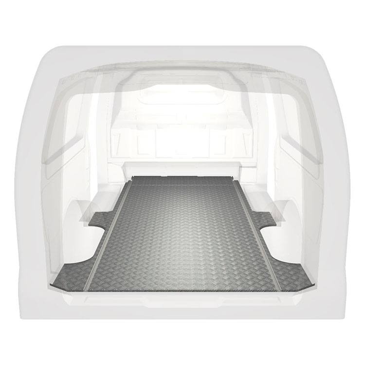 Lätt och robust golv med halkfri aluminiumdurk till en Mercedes Vito. Golvets integrerade skenor (längsgående) används för snabb och säker installation av bilinredning och andra tillbehör.