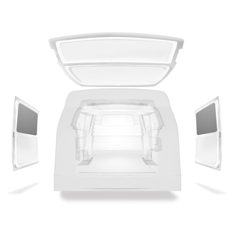 Beklädnad för innerväggar, bakdörrar samt tak säljes separat. Monteringsmaterial säljes också separat.