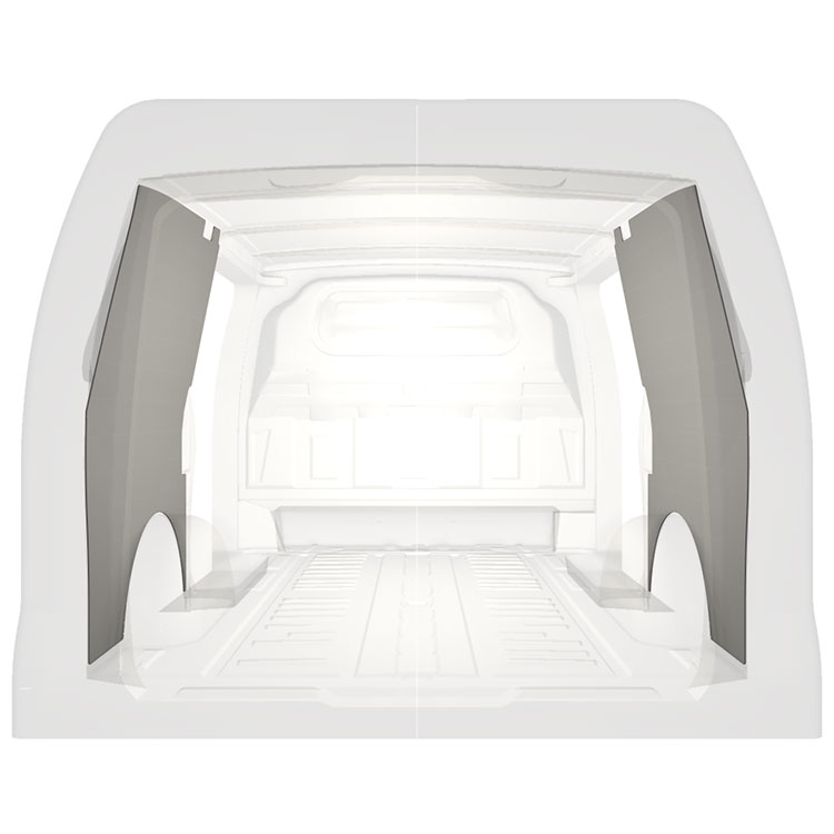 Den färdigskurna beklädnaden är designad för att täcka hela fordonets innerväggar och monteras med skruv.