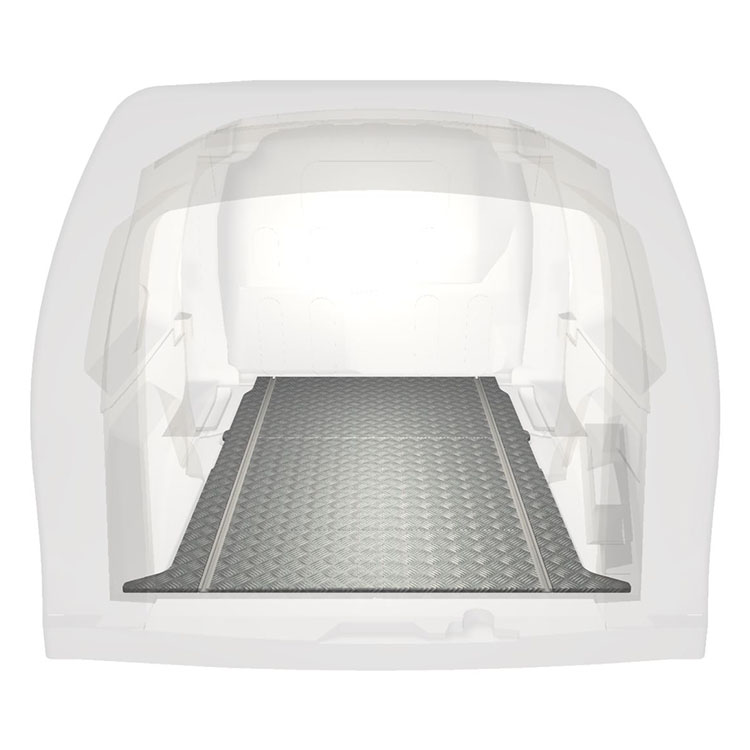Lätt och robust golv med halkfri aluminiumdurk till en Mercedes Citan / Renault Kangoo. Golvets integrerade skenor (längsgående) används för snabb och säker installation av bilinredning och andra tillbehör.