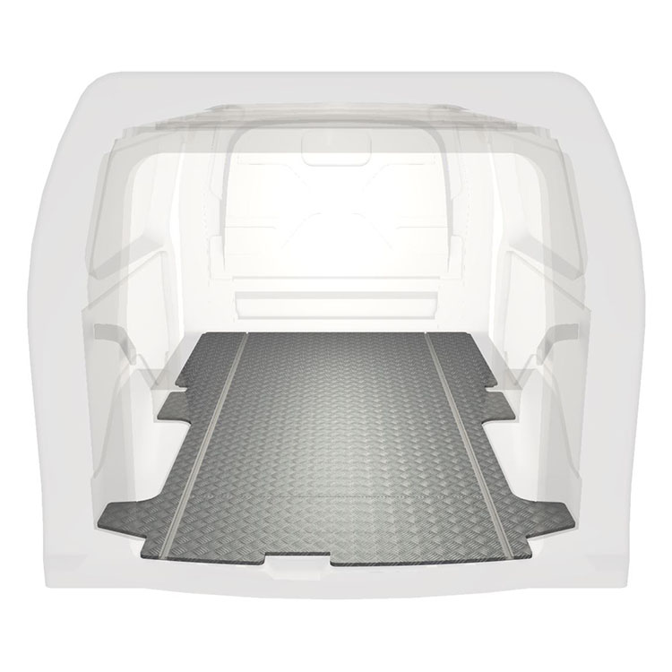 Lätt och robust golv med halkfri aluminiumdurk till en Ford Transit Custom. Golvets integrerade skenor (längsgående) används för snabb och säker installation av bilinredning och andra tillbehör.