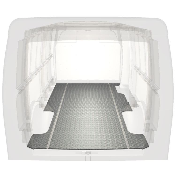 Lätt och robust golv med halkfri aluminiumdurk till en Iveco Daily. Golvets integrerade skenor (längsgående) används för snabb och säker installation av bilinredning och andra tillbehör.