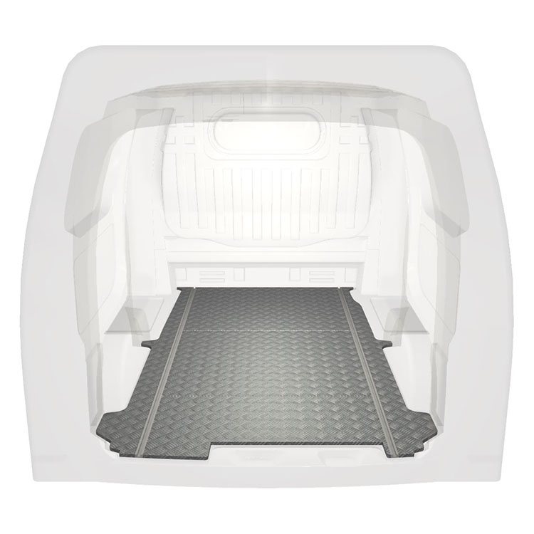 Lätt och robust golv med halkfri aluminiumdurk till en Nissan NV200. Golvets integrerade skenor (längsgående) används för snabb och säker installation av bilinredning och andra tillbehör.