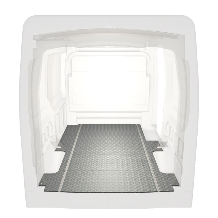 Lätt och robust golv med halkfri aluminiumdurk till en Ford Transit. Golvets integrerade skenor (längsgående) används för snabb och säker installation av bilinredning och andra tillbehör.