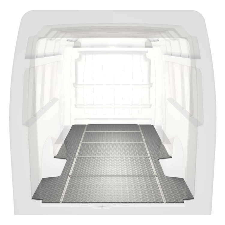 Lätt och robust golv med halkfri aluminiumdurk till en Citroën Jumper / Peugeot Boxer / Fiat Ducato. Golvets integrerade skenor (längsgående och tvärgående) används för snabb och säker installation av bilinredning och andra tillbehör.