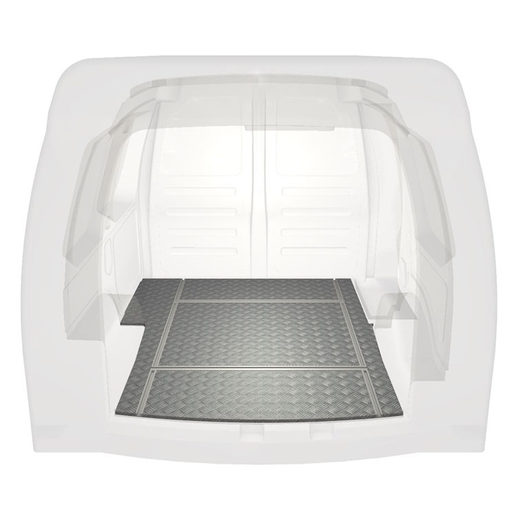 Lätt och robust golv med halkfri aluminiumdurk till en Volkswagen Caddy. Golvets integrerade skenor (längsgående och tvärgående) används för snabb och säker installation av bilinredning och andra tillbehör.
