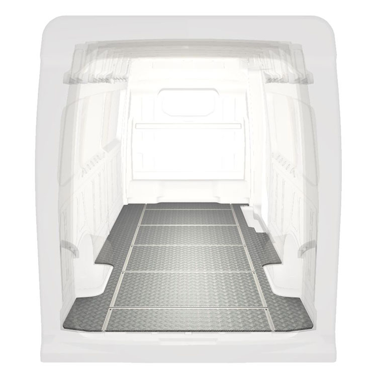 Lätt och robust golv med halkfri aluminiumdurk till en Volkswagen Crafter / MAN TGE . Golvets integrerade skenor (längsgående och tvärgående) används för snabb och säker installation av bilinredning och andra tillbehör.