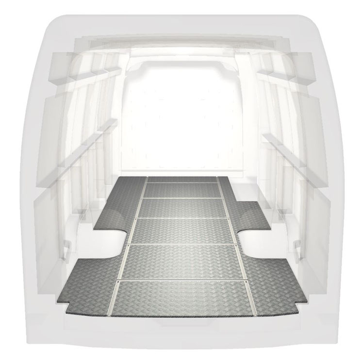 Lätt och robust golv med halkfri aluminiumdurk till en Renault Master / Opel Movano / Nissan NV400. Golvets integrerade skenor (längsgående och tvärgående) används för snabb och säker installation av bilinredning och andra tillbehör.