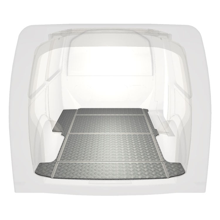 Lätt och robust golv med halkfri aluminiumdurk till en Volkswagen Transporter T6. Golvets integrerade skenor (längsgående och tvärgående) används för snabb och säker installation av bilinredning och andra tillbehör.