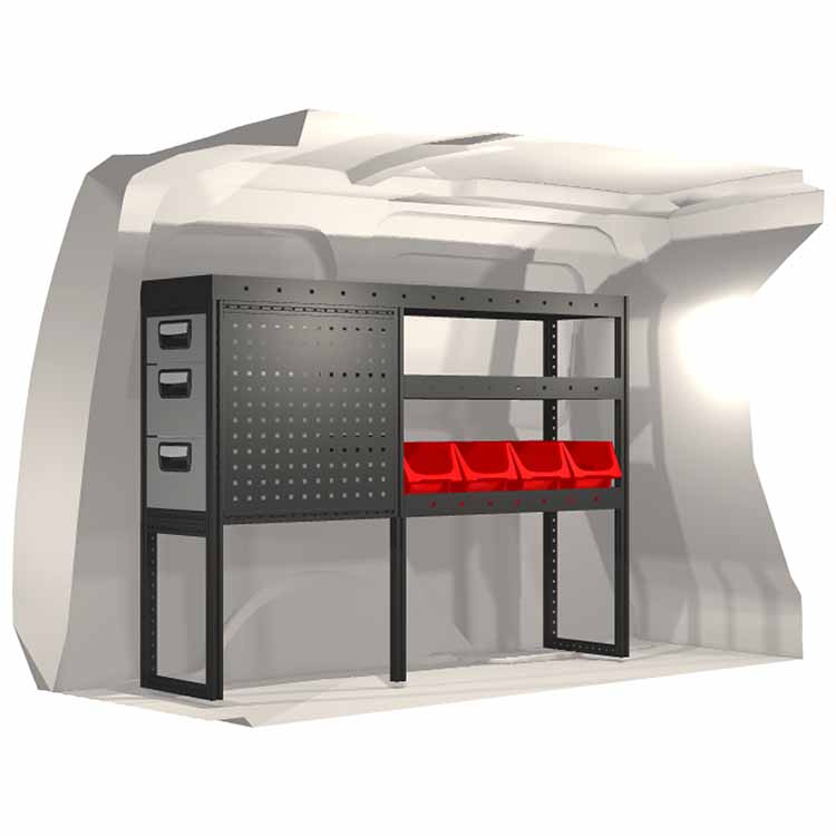 Inredningsförslaget är speciellt utformat för att passa bilmodellen perfekt. I de fall då hurtsar ingår så är dessa utrustade med kullagerskenor samt fullt utdragbara lådor med utdragsstopp. För ökad funktionalitet och minskad ljudnivå under färd är samtliga hyllor utrustade med gummimattor och hurtslådor med skumplast. Monteringssats ingår.