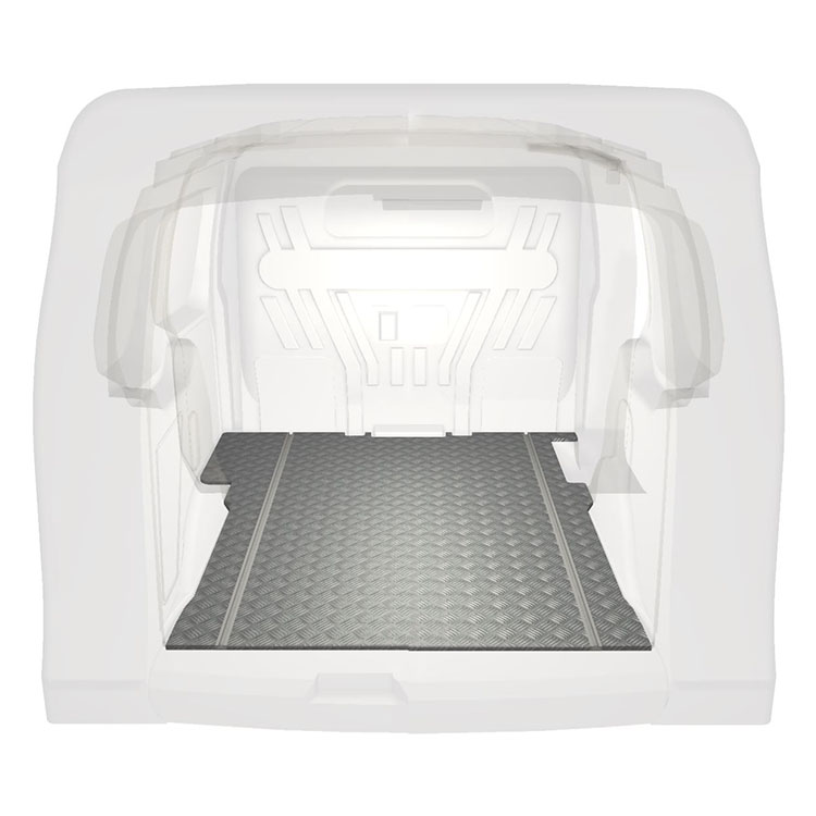 Lightweight and robust extra long floor for Ford Transit Connect with anti-slip aluminum tread plate and cargo rails (longitudinal) for quick and safe installation of racking systems and other accessories.