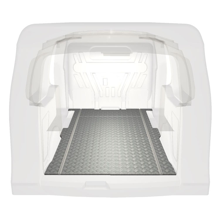 Lätt och robust golv med halkfri aluminiumdurk till en Ford Transit Connect. Golvets integrerade skenor (längsgående) används för snabb och säker installation av bilinredning och andra tillbehör.