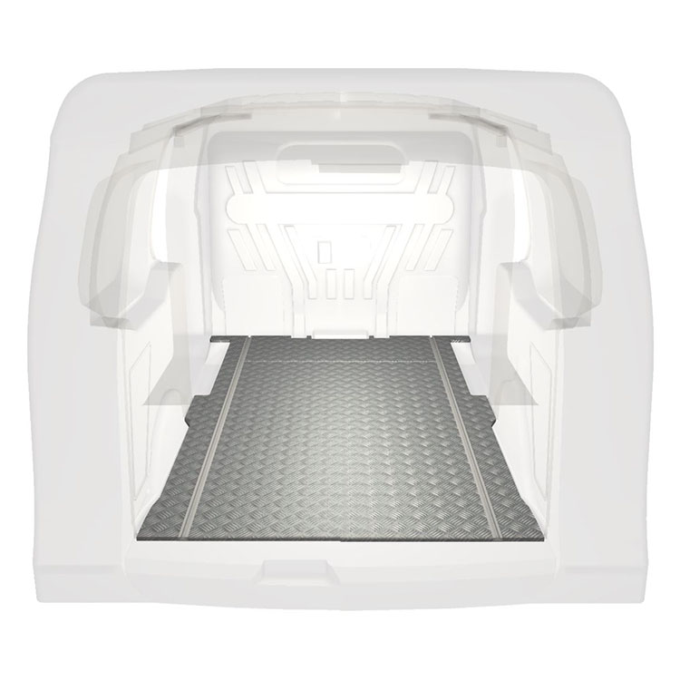 Lätt och robust golv med halkfri aluminiumdurk till en Ford Transit Connect. Golvets integrerade skenor (längsgående) används för snabb och säker installation av bilinredning och andra tillbehör.