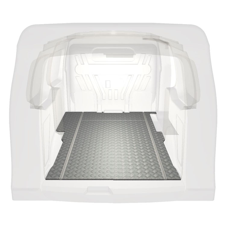 Lightweight and robust extra long floor for Ford Transit Connect with anti-slip aluminum tread plate and cargo rails (longitudinal) for quick and safe installation of racking systems and other accessories.