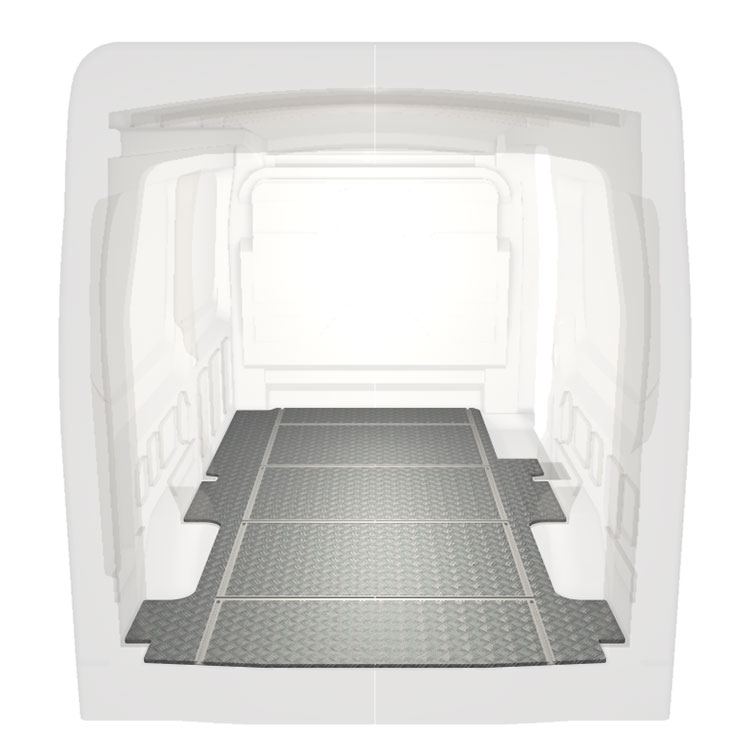 Lätt och robust golv med halkfri aluminiumdurk till en Ford Transit. Golvets integrerade skenor (längsgående och tvärgående) används för snabb och säker installation av bilinredning och andra tillbehör.