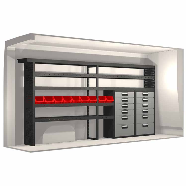 Inredningsförslaget är speciellt utformat för att passa bilmodellen perfekt. I de fall då hurtsar ingår så är dessa utrustade med kullagerskenor samt fullt utdragbara lådor med utdragsstopp. För ökad funktionalitet och minskad ljudnivå under färd är samtliga hyllor utrustade med gummimattor och hurtslådor med skumplast. Monteringssats ingår.