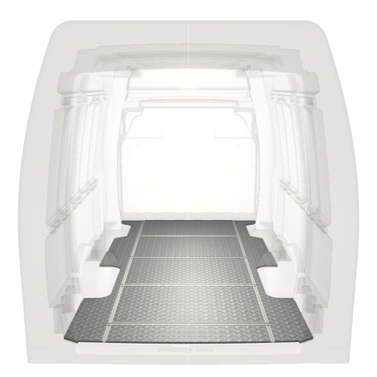 Lätt och robust golv med halkfri aluminiumdurk till en Iveco Daily. Golvets integrerade skenor (längsgående och tvärgående) används för snabb och säker installation av bilinredning och andra tillbehör.