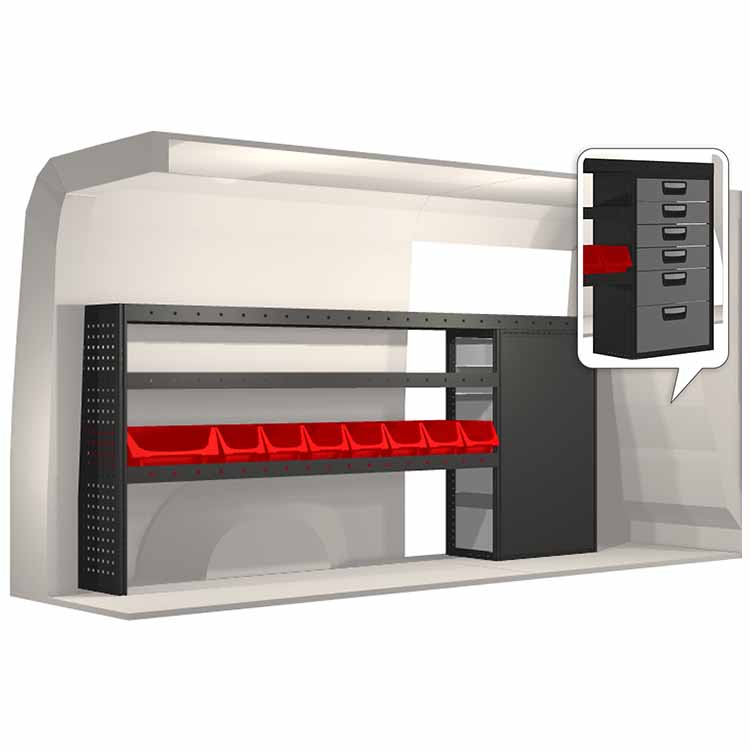 Inredningsförslaget är speciellt utformat för att passa bilmodellen perfekt. I de fall då hurtsar ingår så är dessa utrustade med kullagerskenor samt fullt utdragbara lådor med utdragsstopp. För ökad funktionalitet och minskad ljudnivå under färd är samtliga hyllor utrustade med gummimattor och hurtslådor med skumplast. Monteringssats ingår.