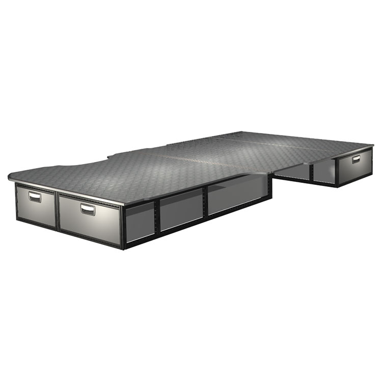 Kitet är designat för installation ovanpå ett trägolv. Dubbelgolvets skenor möjliggör enkelt montage av fordonsinredning och kantlister bidrar till en snygg finish.