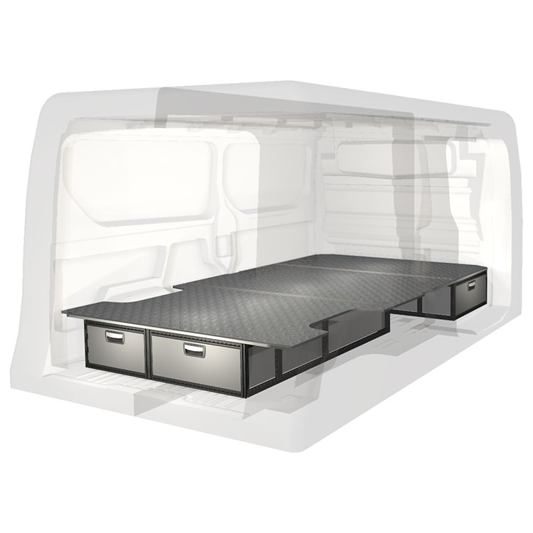 Kitet är designat för installation ovanpå ett trägolv. Dubbelgolvets skenor möjliggör enkelt montage av fordonsinredning och kantlister bidrar till en snygg finish.