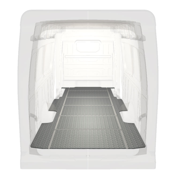 Lätt och robust golv med halkfri aluminiumdurk till en Volkswagen Crafter / MAN TGE . Golvets integrerade skenor (längsgående och tvärgående) används för snabb och säker installation av bilinredning och andra tillbehör.