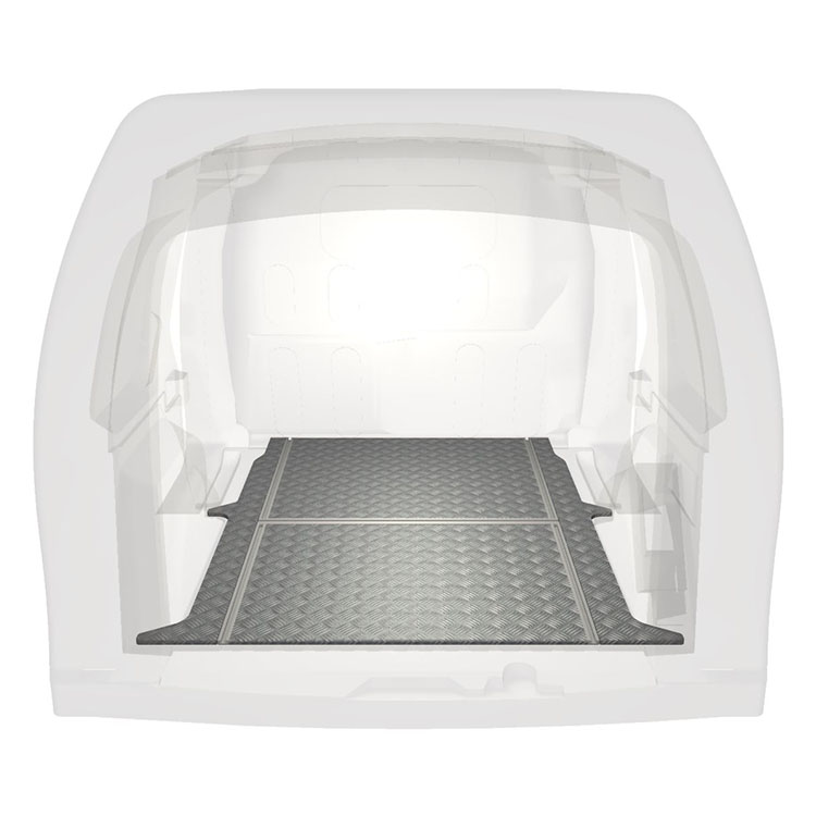 Lätt och robust golv med halkfri aluminiumdurk till en Mercedes Citan / Renault Kangoo. Golvets integrerade skenor (längsgående och tvärgående) används för snabb och säker installation av bilinredning och andra tillbehör.