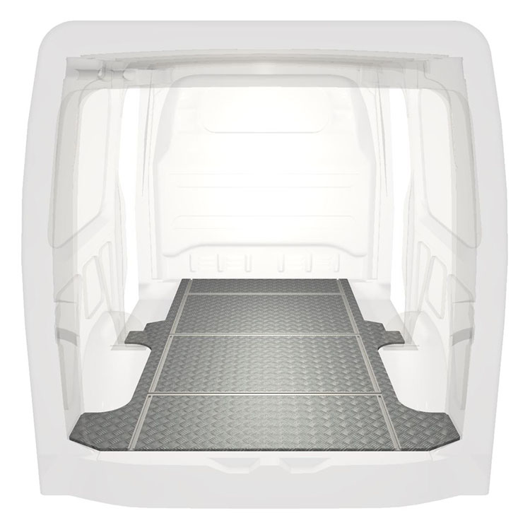 Lätt och robust golv med halkfri aluminiumdurk till en Mercedes Sprinter. Golvets integrerade skenor (längsgående och tvärgående) används för snabb och säker installation av bilinredning och andra tillbehör.