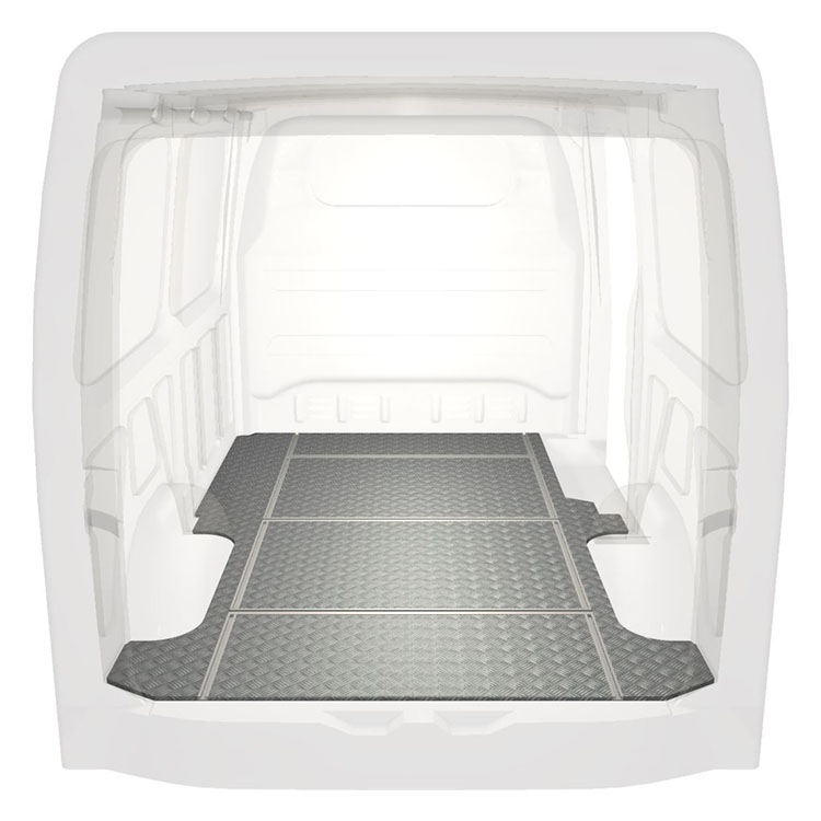 Lätt och robust golv med halkfri aluminiumdurk till en Mercedes Sprinter. Golvets integrerade skenor (längsgående och tvärgående) används för snabb och säker installation av bilinredning och andra tillbehör.