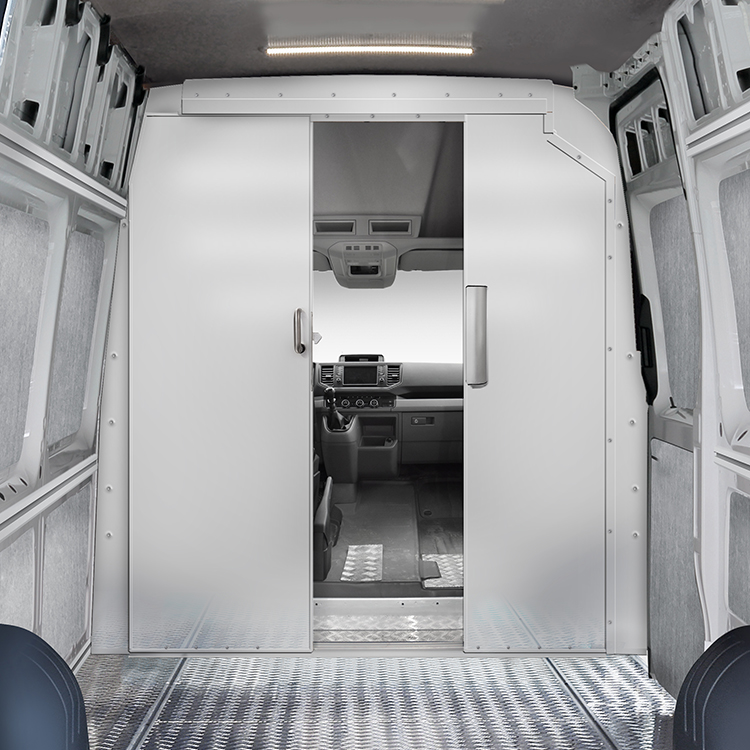 | The bulkhead, made from lightweight material, is equipped with a sliding door for quick and easy access to the cargo area from the cabin. The door is centered to create maximal space between the driver and passenger seat, making loading and unloading easier and more efficient. This bulkhead comes with an extra high door which requires a high cabin roof or modification of low cabin roof. This bulkhead comes prepared for a grab handle positioned by the vehicle side door. The grab handle allows for easy entry and exit through the side-door. The bulkhead is pre-assembled in the Modul-System factory, which allows for quick and easy installation in the vehicle. Door height: 1889 mm Installation time: 1 hour |