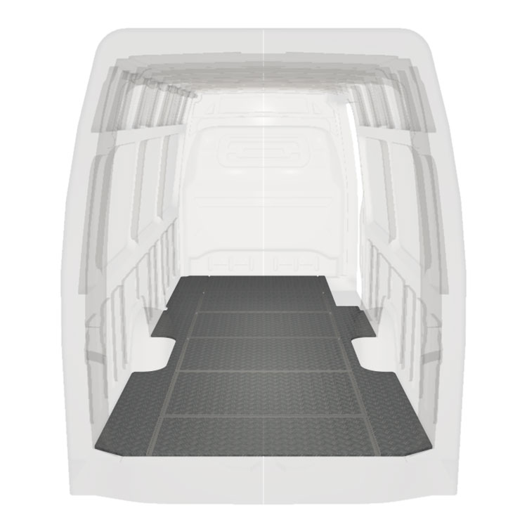 Lätt och robust golv med halkfri aluminiumdurk till en Mercedes Sprinter. Golvets integrerade skenor (längsgående och tvärgående) används för snabb och säker installation av bilinredning och andra tillbehör.