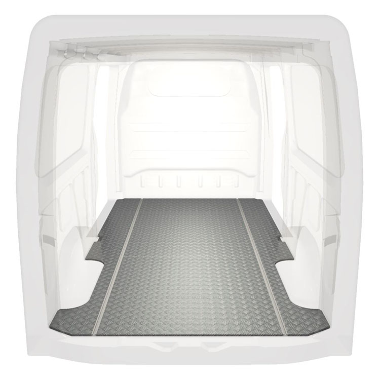 Lätt och robust golv med halkfri aluminiumdurk till en Mercedes Sprinter. Golvets integrerade skenor (längsgående) används för snabb och säker installation av bilinredning och andra tillbehör.