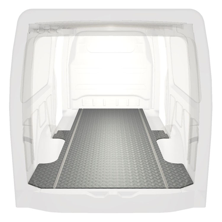 Lätt och robust golv med halkfri aluminiumdurk till en Mercedes Sprinter. Golvets integrerade skenor (längsgående) används för snabb och säker installation av bilinredning och andra tillbehör.