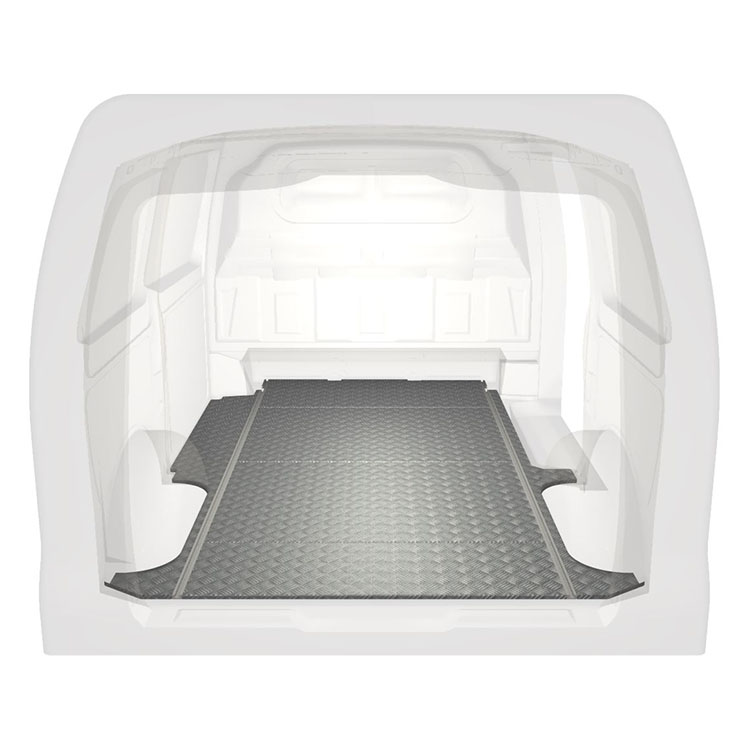 Lätt och robust golv med halkfri aluminiumdurk till en Mercedes Vito. Golvets integrerade skenor (längsgående) används för snabb och säker installation av bilinredning och andra tillbehör.