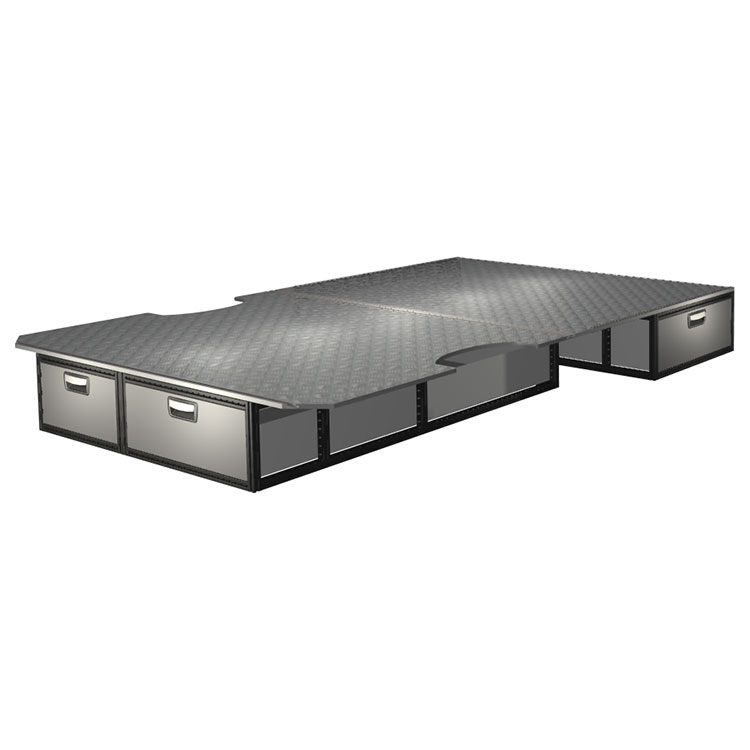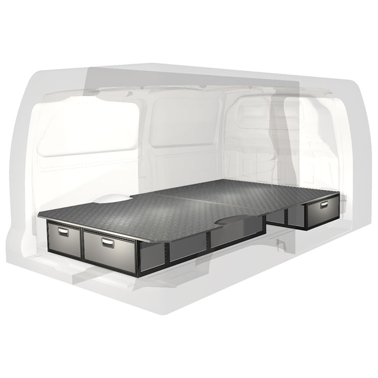 Kitet är designat för installation ovanpå ett trägolv. Dubbelgolvets skenor möjliggör enkelt montage av fordonsinredning och kantlister bidrar till en snygg finish.