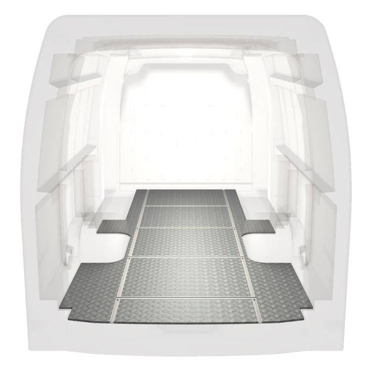 Lätt och robust golv med halkfri aluminiumdurk till en Renault Master / Opel Movano / Nissan NV400. Golvets integrerade skenor (längsgående och tvärgående) används för snabb och säker installation av bilinredning och andra tillbehör.