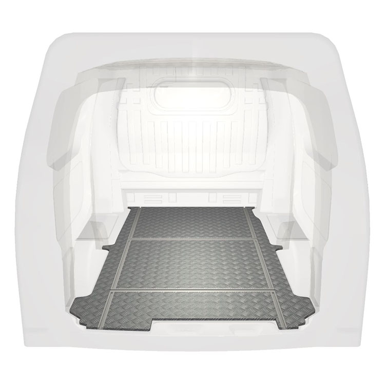 Lätt och robust golv med halkfri aluminiumdurk till en Nissan NV200. Golvets integrerade skenor (längsgående och tvärgående) används för snabb och säker installation av bilinredning och andra tillbehör.