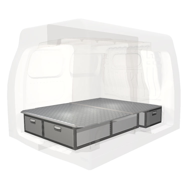 Kitet är designat för installation ovanpå ett trägolv. Dubbelgolvets skenor möjliggör enkelt montage av fordonsinredning och kantlister bidrar till en snygg finish.
